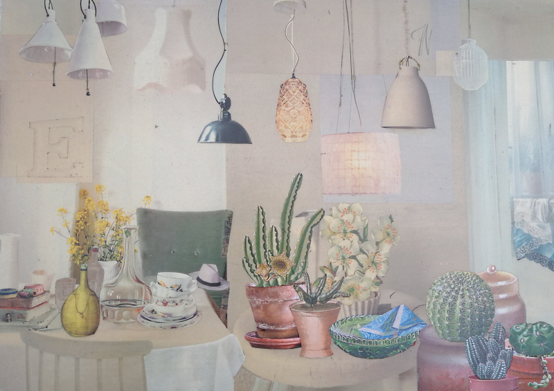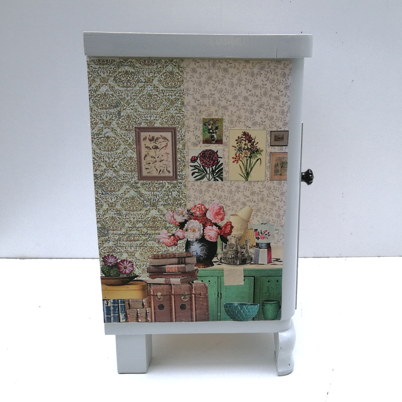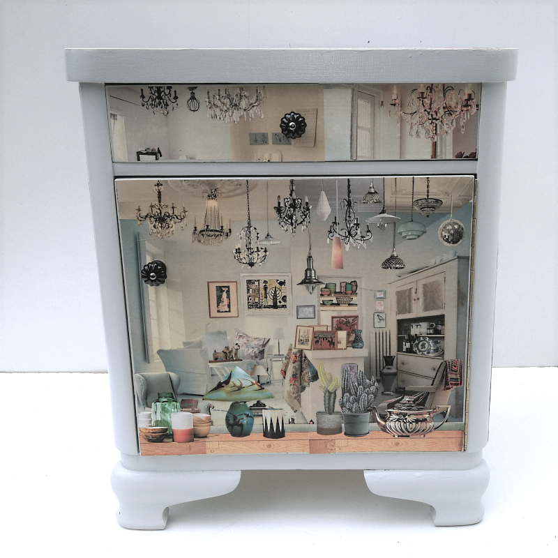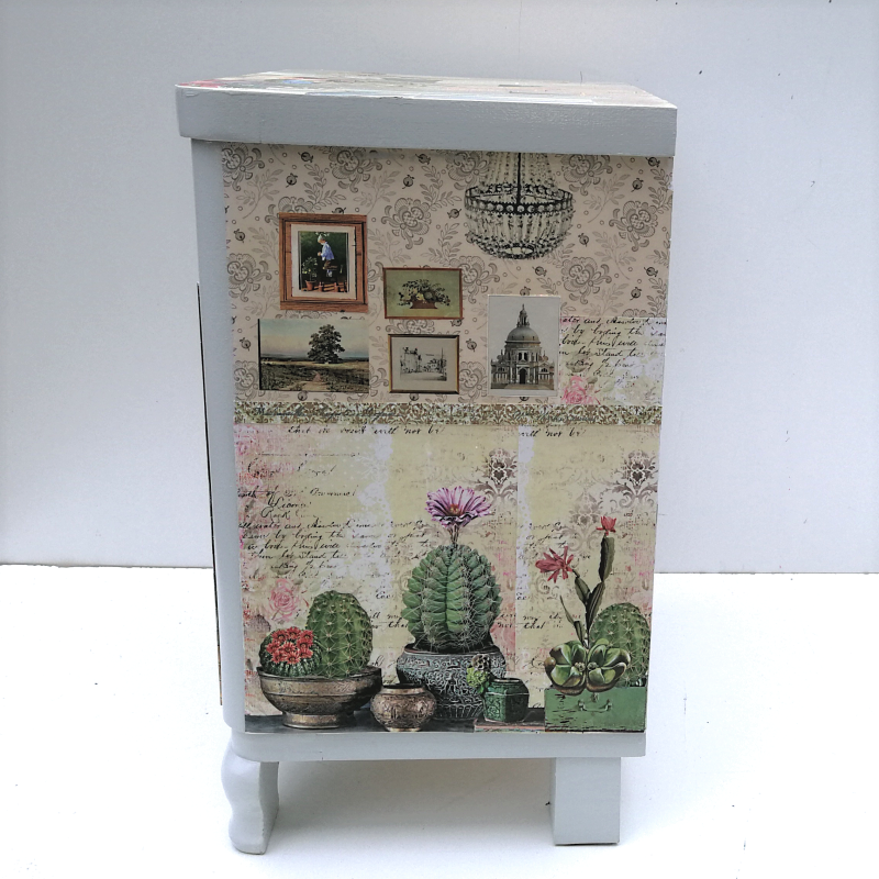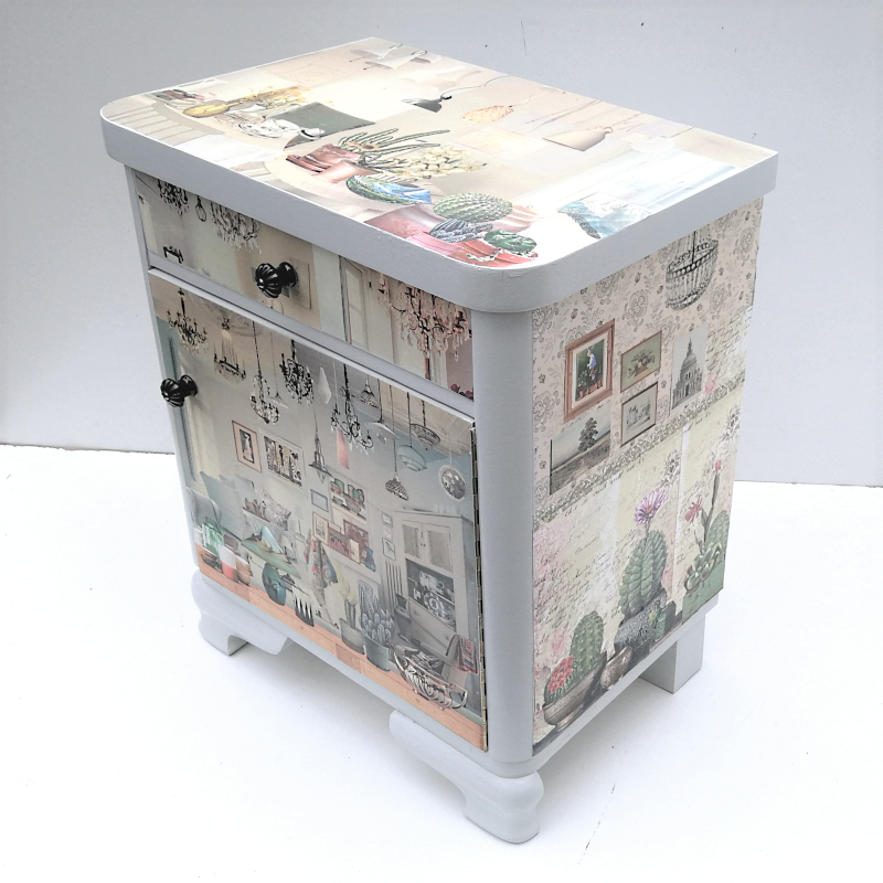 UNIKAT! Kommode mit geschwungenen Beinen, einer Schublade, einer Tür und Porzellanknöpfen. Alle Flächen sind mit Vollbildgestaltung versehen: Einblicke in einen kleinen Einrichtungsladen. Auf der Tür sieht man durch das Schaufenster in den Laden hinein. Im Schaufenster stehen neben Geschirr und Vasen Kakteen und eine Tischlampe. Die übrigen Flächen zeigen Teilausschnitte des Ladens mit Bilderwänden, Interieur und Kakteen. VERSAND MÖGLICH.