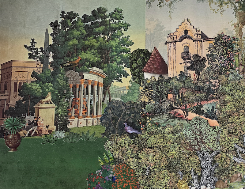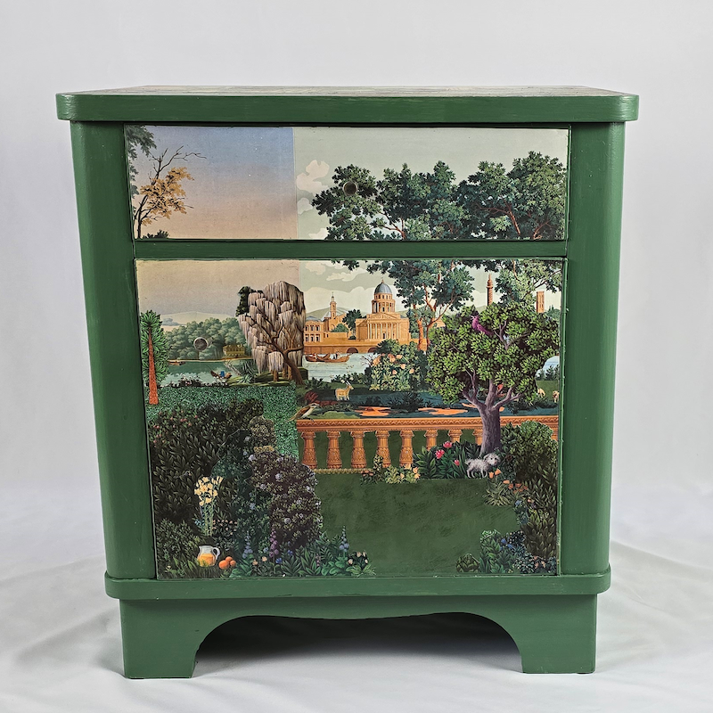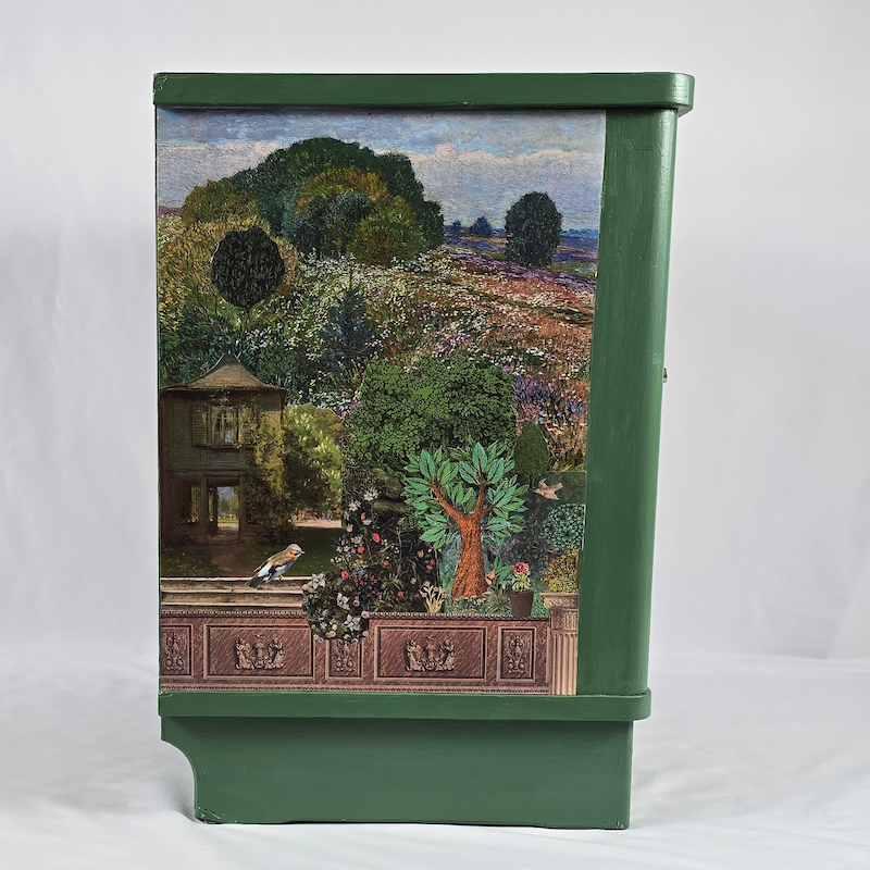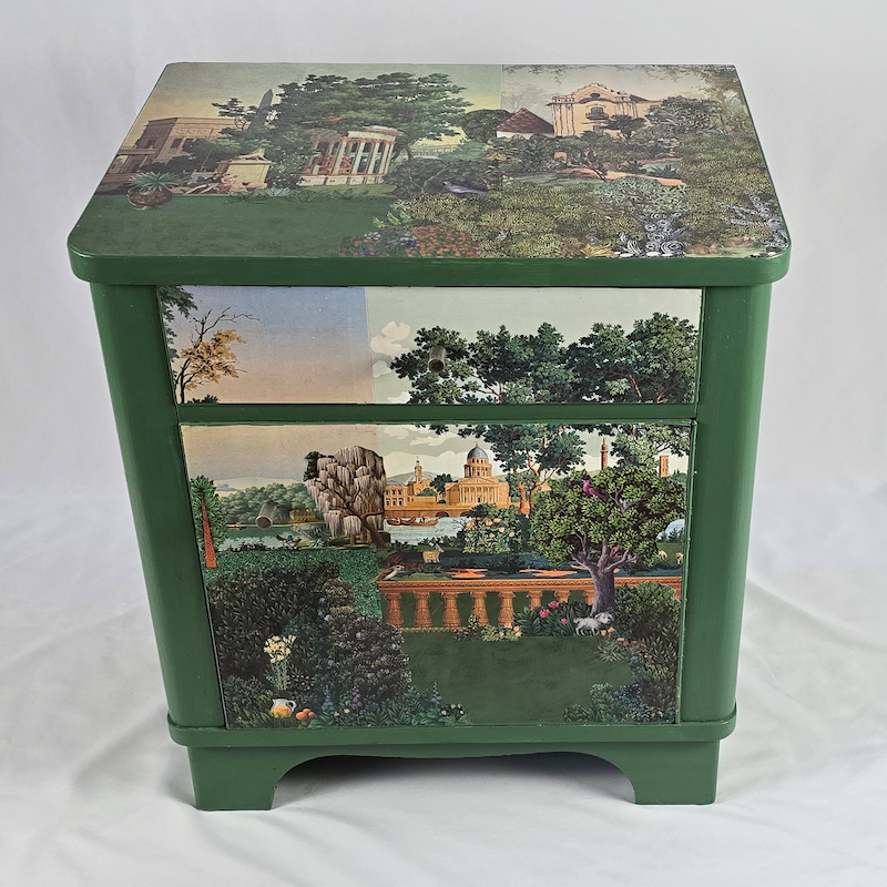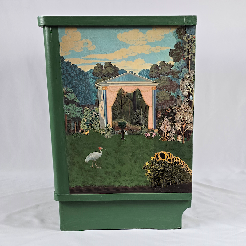 UNIKAT! Kommode mit einer Schublade, einer Tür und Messingknöpfen. Vor einem Hintergrund von Schlössern und Gutshäusern sieht man grüne Gartenanlagen mit Zäunen und Mauern. In Blütenbeeten tummeln sich Tiere: Vögel, ein Hund, zwei Hasen und ein Ibis. VERSAND MÖGLICH.