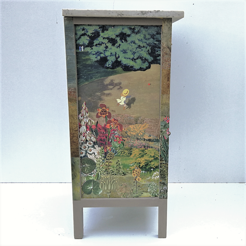 UNIKAT! Hohe Kommode mit einer Tür, einer Schublade, Originalgriffen und Marmorplatte. Thema der Kommodengestaltung ist die Verbindung zwischen Garten- und Parkflächen mit einem Innenraum. Die Verbindung zwischen den Seiten (rechte Seite: Garten am Fluss mit Boot und einer jungen Frau im Gras; linke Seite: Park mit spielendem Kind) besteht über die ebenfalls gestalteten Seitenstreben. Dadurch wächst der Garten ins Zimmer hinein. Im Zimmer sieht man eine lesende Frau am Fenster und Topfpflanzen. KEIN VERSAND. Bitte in der Werkstatt nachfragen, ob und wann eine Anlieferung innerhalb Deutschlands möglich ist, oder Spedition beauftragen.