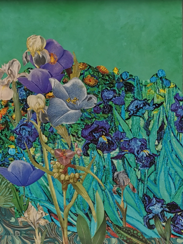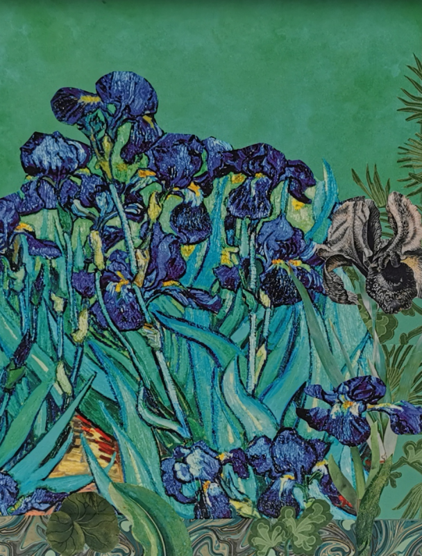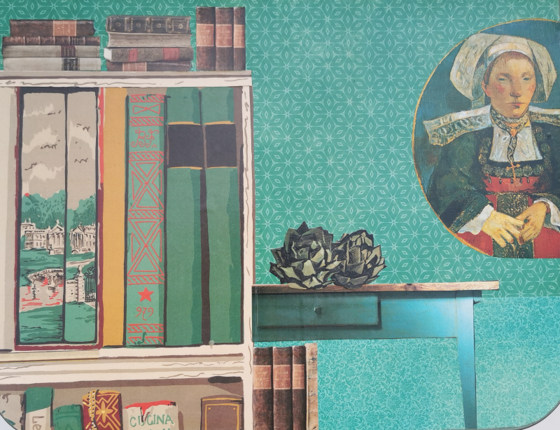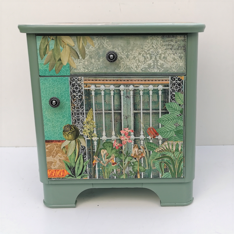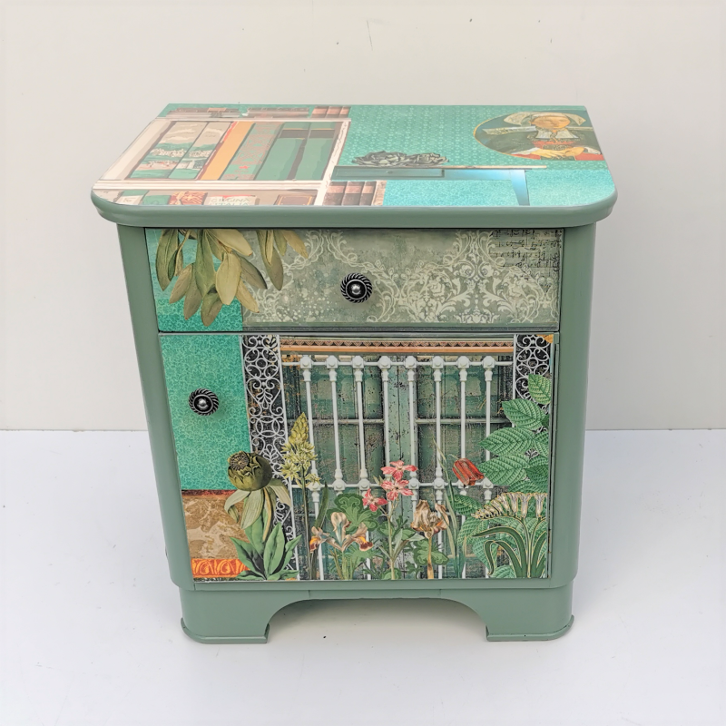 UNIKAT! Niedrige Kommode mit einer Schublade, einer Tür und Metallgriffen. Auf der Front: Vergittertes Fenster mit Blumenbeet und grüner Hauswand, auf der Deckplatte: Zimmer mit Bücherregal, Tisch mit Artischocken und Wandbild "La Belle Angele" (von Gauguin)auf grüner Mustertapete; Seitengestaltung Beete mit Iris von van Gogh auf smaragdfarbenem Hintergrund. VERSAND MÖGLICH.