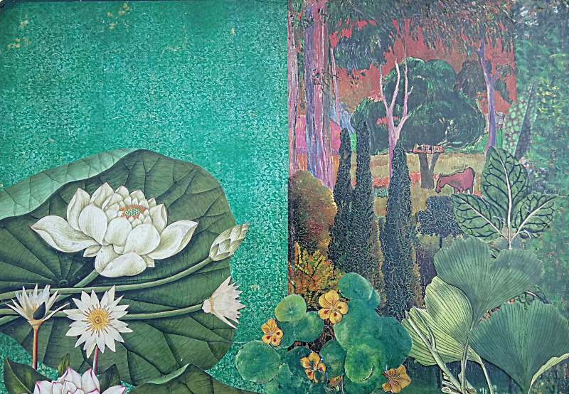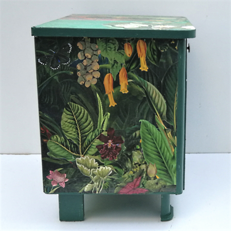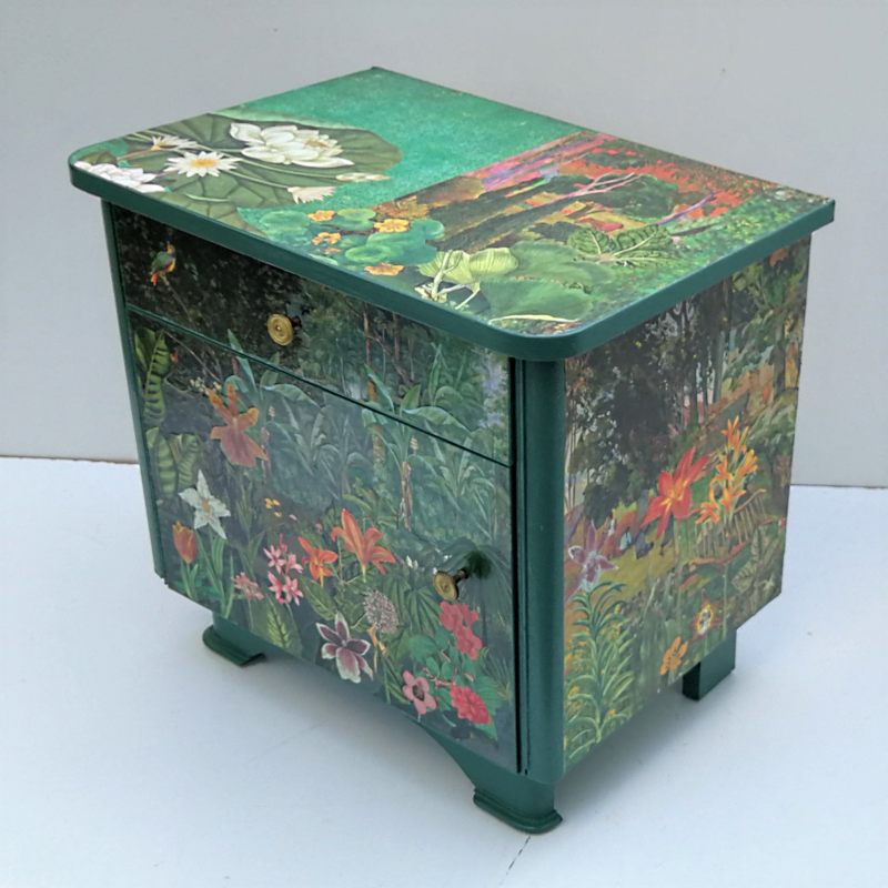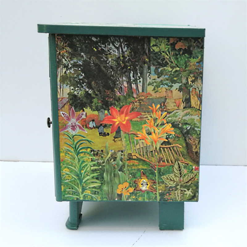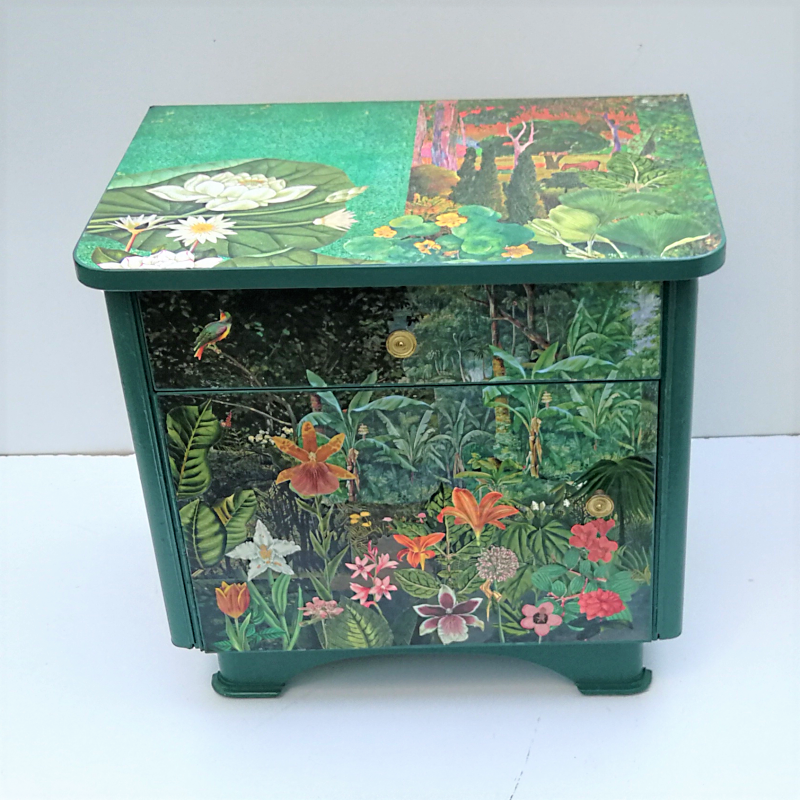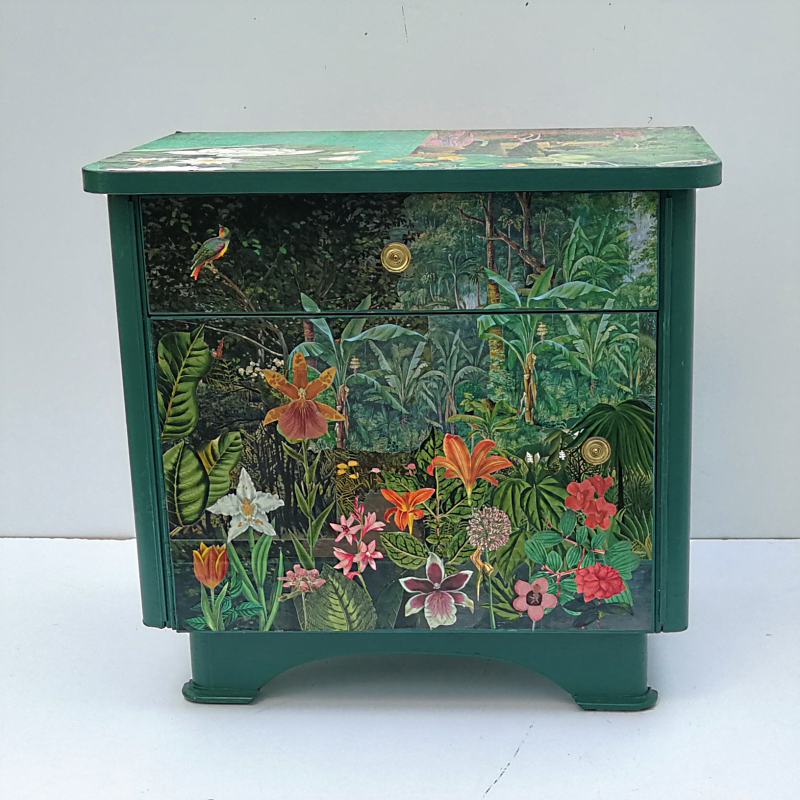 UNIKAT! Niedrige Kommode mit einer Schublade, einer Tür und Porzellangriffen. Auf dunkelgrünem Hintergrund blickt man auf der Tür und auf der linken Seite in einen Dschungel mit Palmen; Reproduktionen von Gemälden von Gauguin aus der Südsee bilden dort den HIntergrund für eine üppige Flora. VERSAND MÖGLICH.