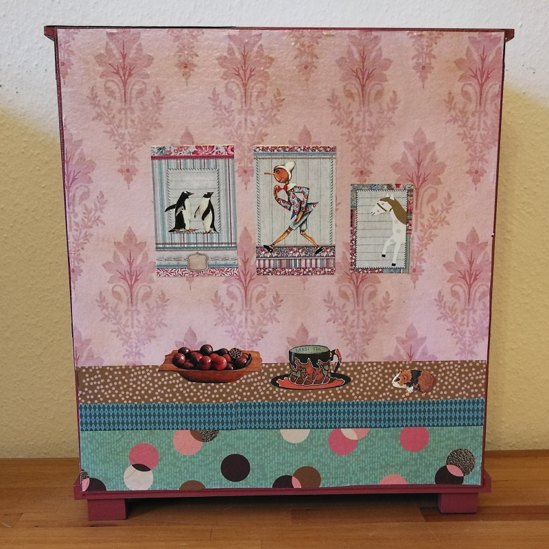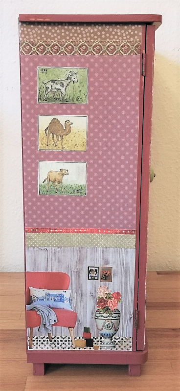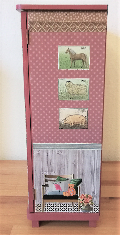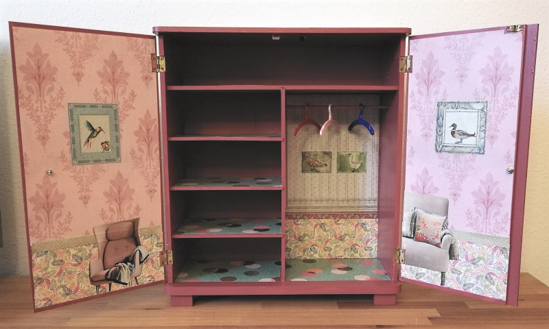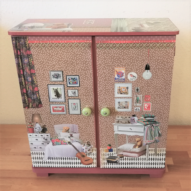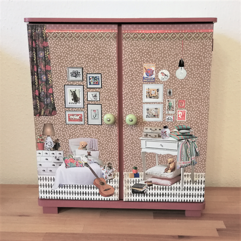 UNIKAT! Großer Puppenschrank mit weißen Porzellangriffen, vier Innenbrettern und Kleiderstange. Auf allen Flächen sieht man in Kinderzimmer mit Teddies und Spielzeug. Am Kinderbett lehnt Papas Gitarre. Die Farbgestaltung besteht aus Pink, Altrosa und Brauntönen. VERSAND MÖGLICH.