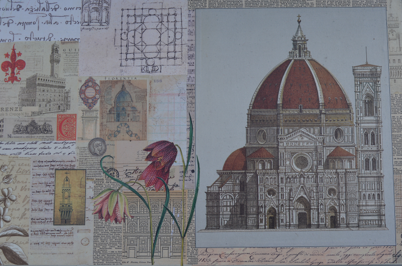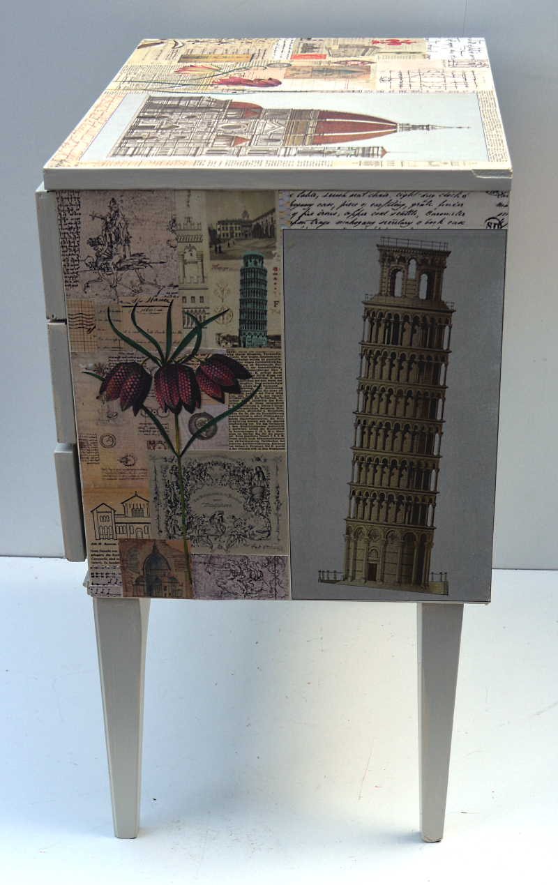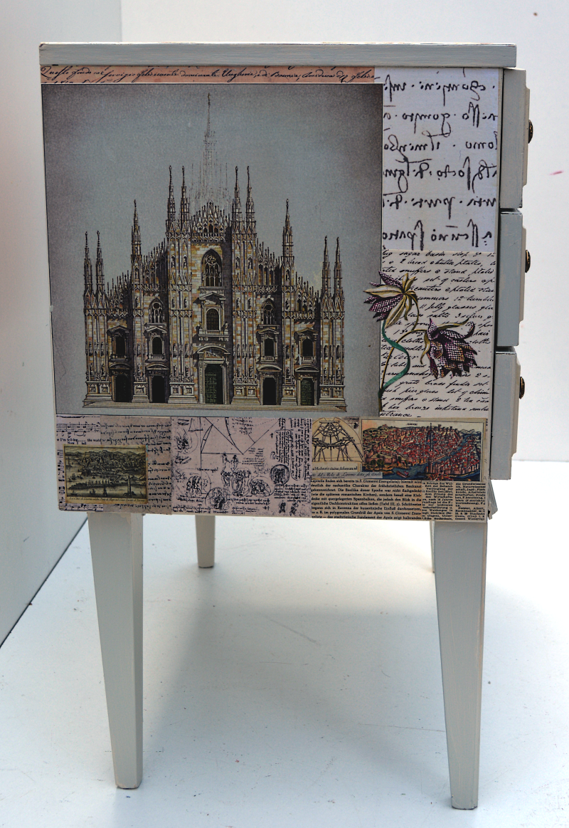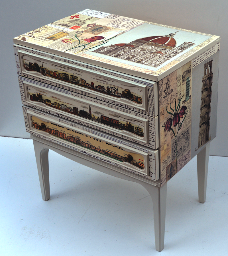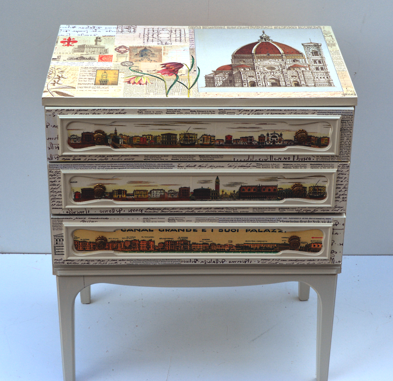 UNIKAT! Schubladenkommode mit Messinggriffen, gestaltet mit Abbildungen von Florenz, Pisa, Mailand und Venedig, Schriftpapieren, Ausschnitten aus Zeichnungen von Leonardo da Vinci und Abbildungen von Schachbrettblumen. NEU: KEIN VERSAND. Bitte nachfragen, ob eine Anlieferung innerhalb Deutschlands möglich ist oder Spedition beauftragen.