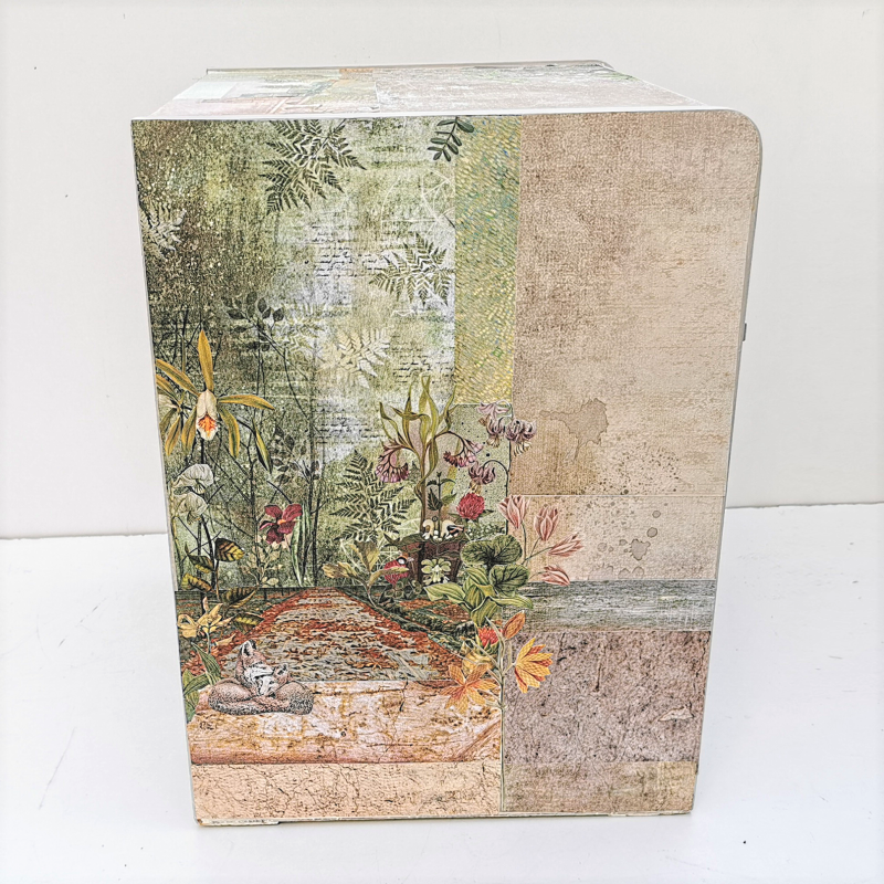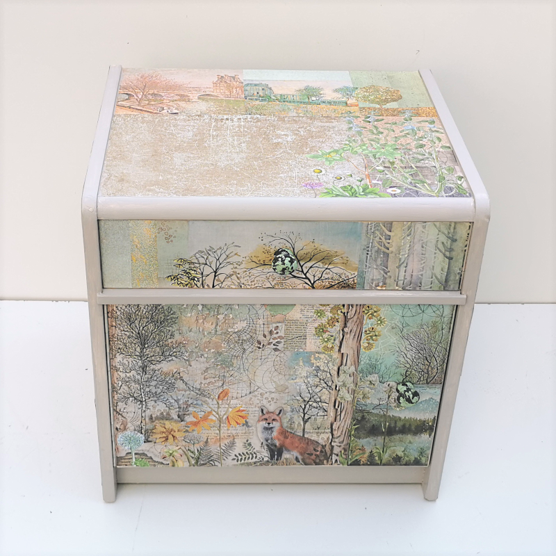 UNIKAT! Niedrige Kommode mit patinierten Messinggriffen und einer aufwändigen monochromen Gestaltung mit Landschaften, Blumenbeeten und Füchsen. VERSAND MÖGLICH.