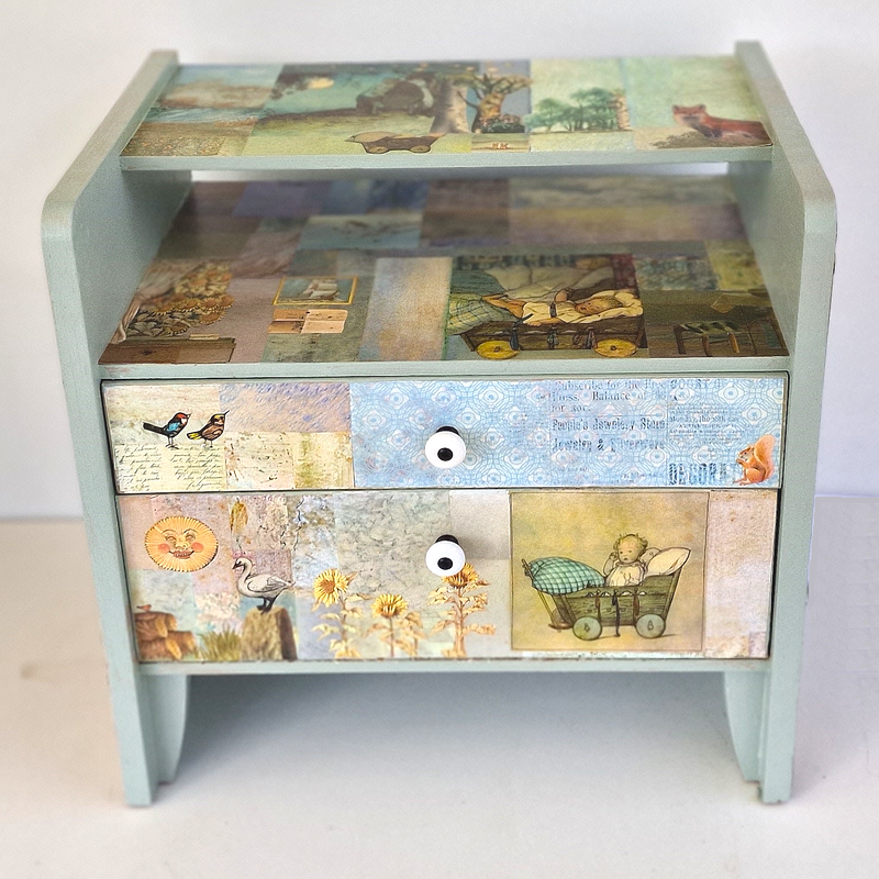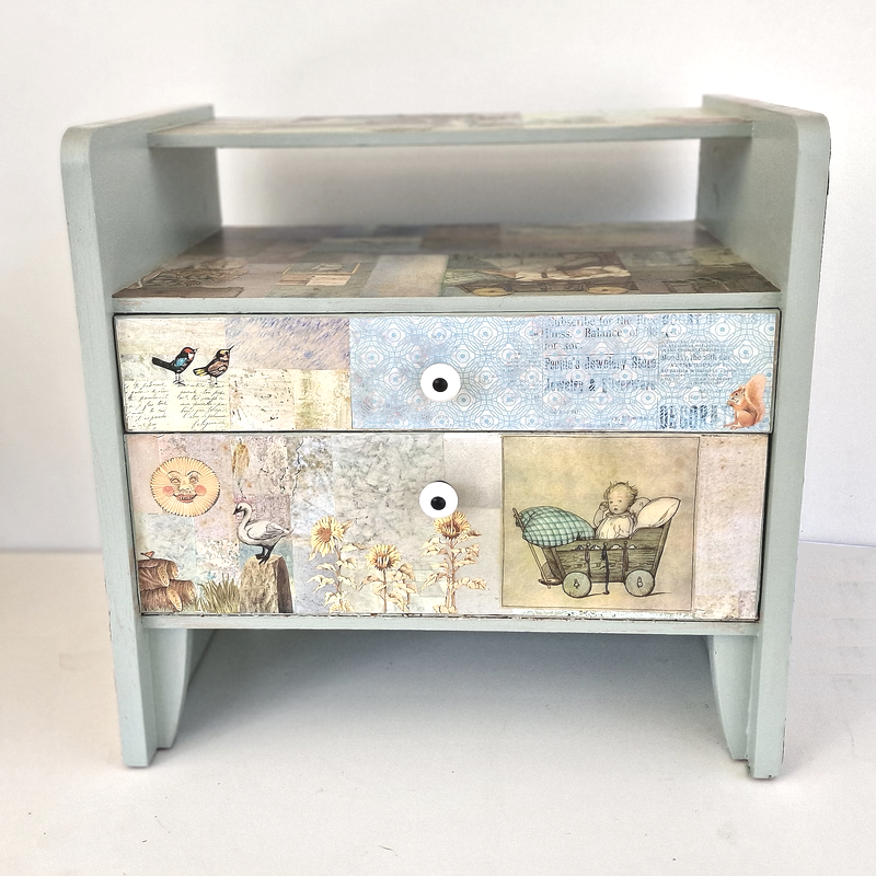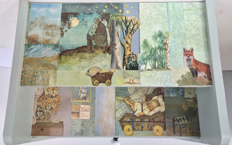 UNIKAT! Niedrige Kommode mit einer Schublade, einer Klappe, einem offenen Fach und Porzellangriffen. Das Märchen vom Kleinen Hävelmann schrieb Theodor Storm für seinen kleinen Sohn. Illustrationen des Kinderbuchs von Else Wenz-Vietor bilden die Grundlage für die Gestaltung der Kommode. Die quadratischen Bilder werden von Rechtecken in Pastellfarben gerahmt, wobei die Bilder vorsichtig um Bäume, Blumen und Tiere des Waldes erweitert werden. VERSAND MÖGLICH.