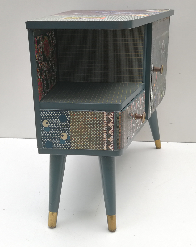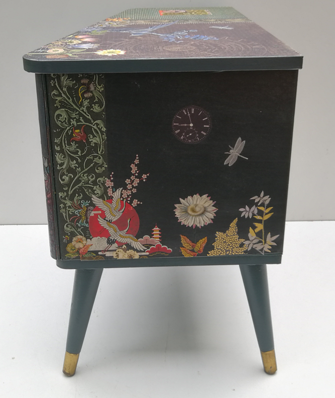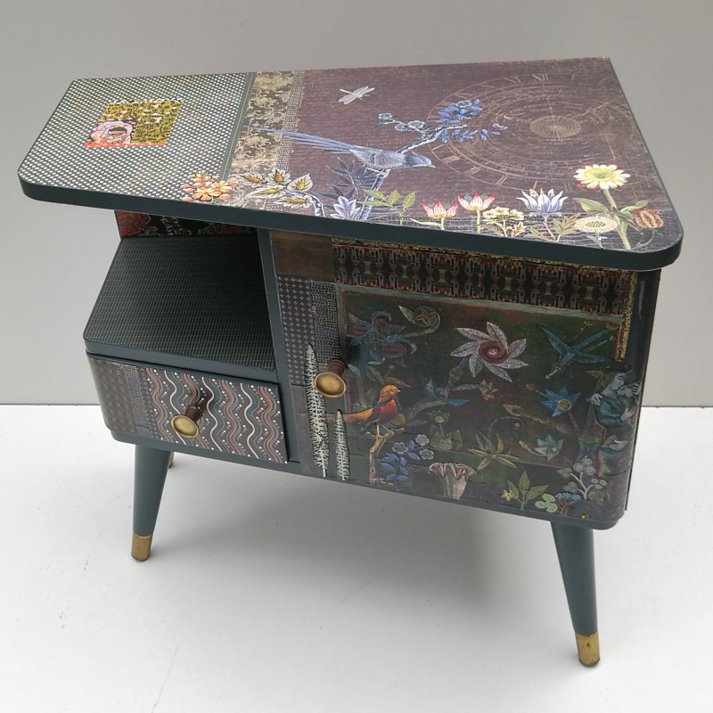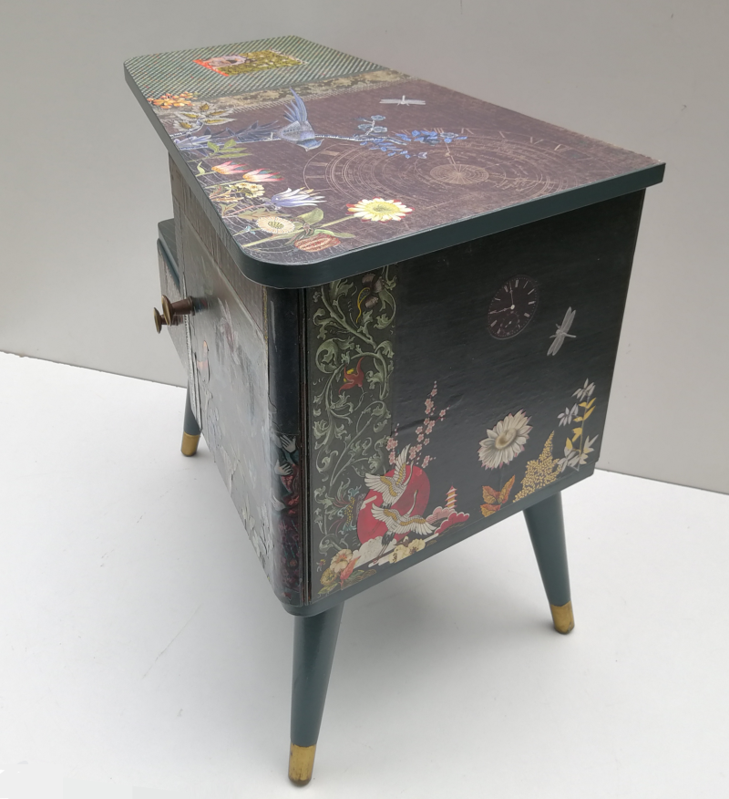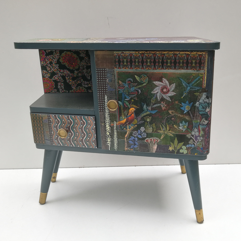 UNIKAT! Niedrige Kommode mit einem offenen Fach, einer Schublade, einer Tür und Metallgriffen. Die Gestaltung besteht aus einer Kombination von Musterpapieren und Ausschnitten aus Kunstdrucken. Auf der Tür trifft sich ein Liebespaar zwischen Fantasieblumen. Einige Vögel und ein Gemälde von Picasso auf der Deckplatte vervollständigen die nächtliche Gestaltung. VERSAND MÖGLICH.