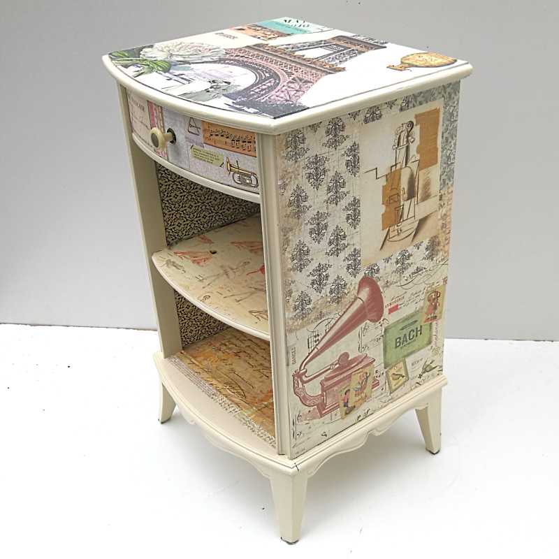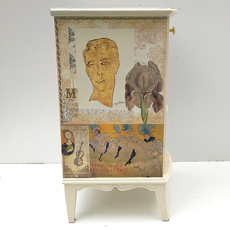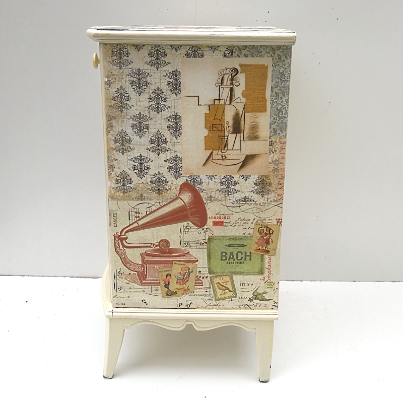 UNIKAT! Offene, hohe Kommode mit Zwischenbrett, Schublade mit Bakalitknopf. Ein Grammophon, Werbeplakate von Toulouse Lautrec, Ausschnitte aus Gemälden von Max Ernst, Pablo Picasso und Andy Warhol und Musikinstrumente auf Musterpapieren bestimmen die Gestaltung zum Thema Musik. In den offenen Fächern gesellen sich ein Notenpapier mit Tänzerinnen und Schriftpapier zur Gestaltung, und auf der Deckplatte fällt der Blick auf den Eiffelturm mit Pfingstrose. VERSAND MÖGLICH.