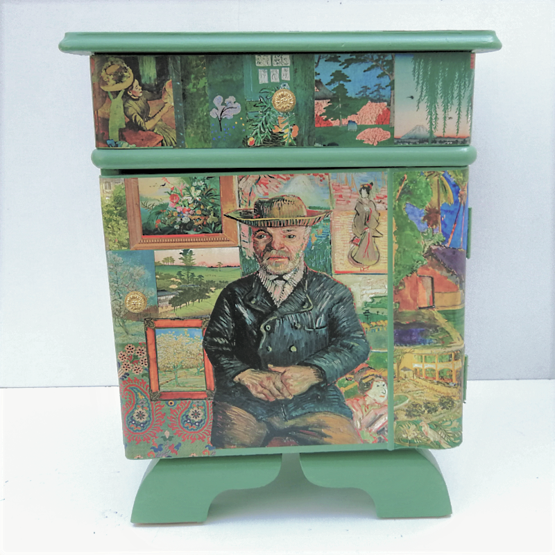 UNIKAT! Hohe Kommode mit einer Schublade, einer Tür, Metallgriffen und geschwungenen Beinen. Das Gemälde van Goghs mit seinem Kunsthändler Père Tanguy, der vor einer Bildergalerie sitzt, diente als Anregung für die aufwändige Gestaltung der farbenprächtigen Kommode. Hier werden impressionistische und expressionistische Landschaften und Gärten als Hintergrund für Porträts von van Gogh , Gauguin, Manet, Cezanne und Picasso verwendet. Zu ihnen gesellen sich japanische Landschaften in Bilderrahmen und auf der Schublade. VERSAND MÖGLICH.