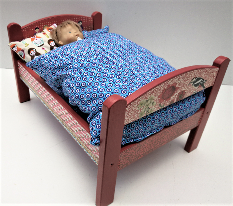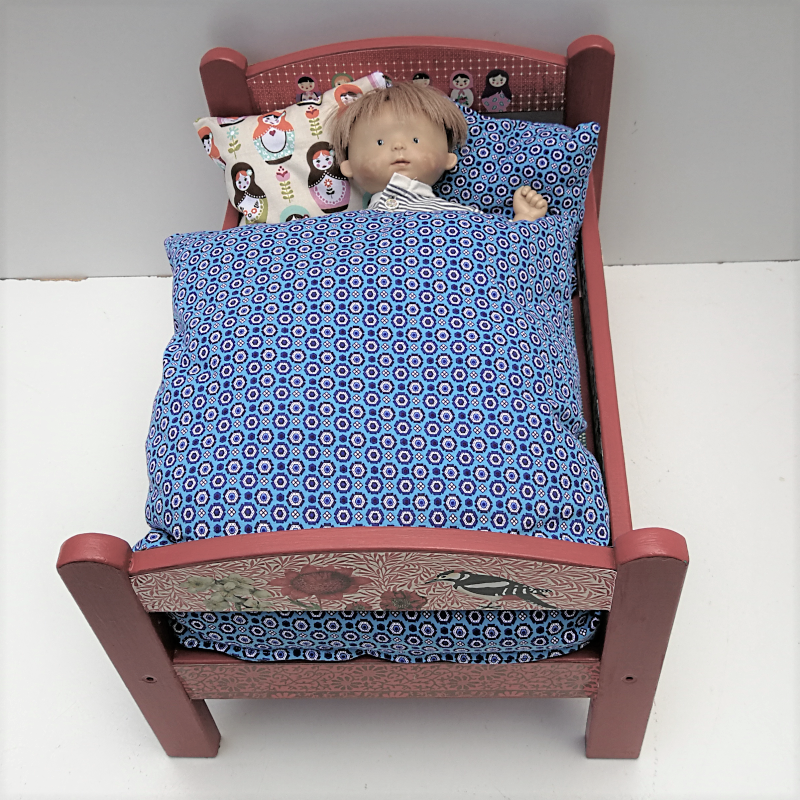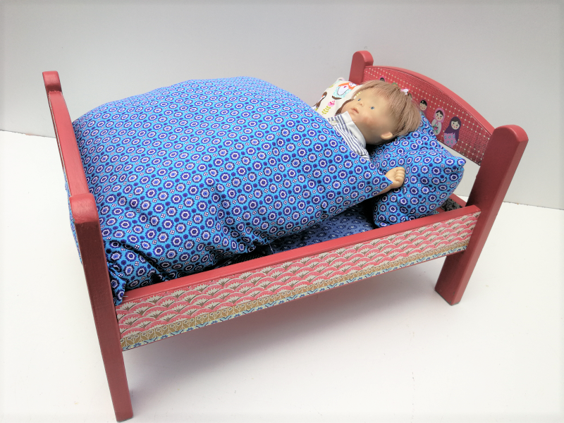 UNIKAT! Puppenbett mit dazu passender, selbst genähter Bettwäsche, die mit Bastelwatte gefüllt ist und komplett in der Waschmaschine gewaschen werden kann. Die Gestaltung des Bettes ist in leuchtenden Rottönen gehalten. Auf dem Betthaupt sind Matroschkas in einer Reihe aufgestellt. Zur Bettwäsche gehört ein kleines Kopfkissen mit Matroschkas. Dieses Puppenbett passt farblich zum Puppenschrank "Vögel im Mohnbeet" (125 €). Komplettpreis für Bett und Schrank: 175 €. VERSAND MÖGLICH. (Die abgebildete Puppe gehört nicht zum Puppenbett, sie ist aus Privatbesitz.)