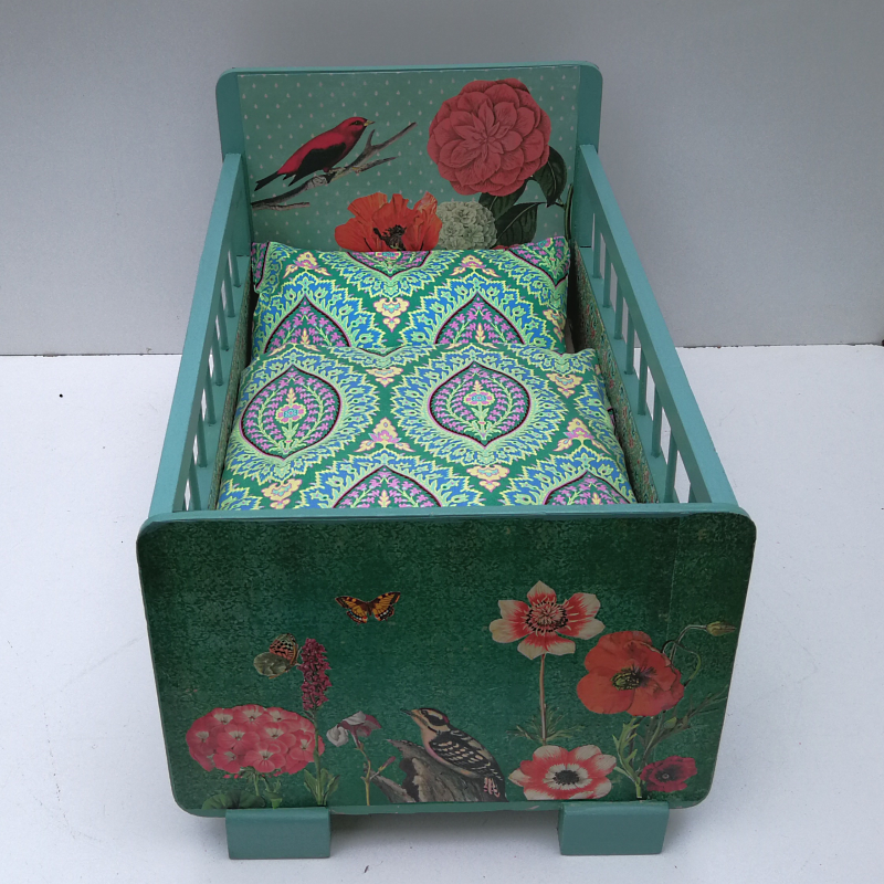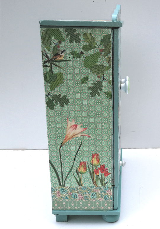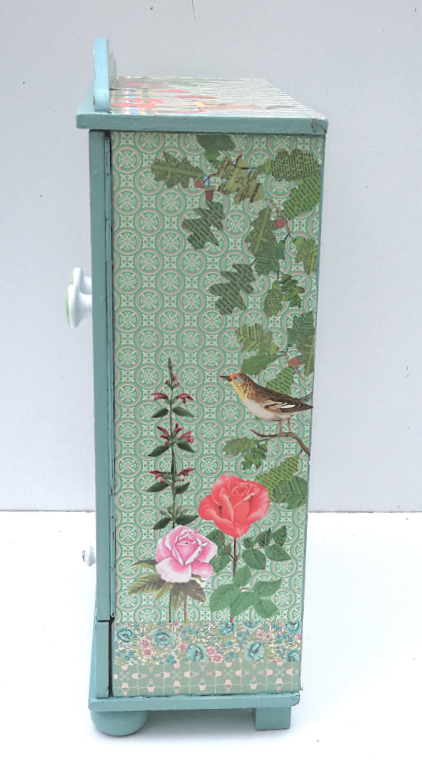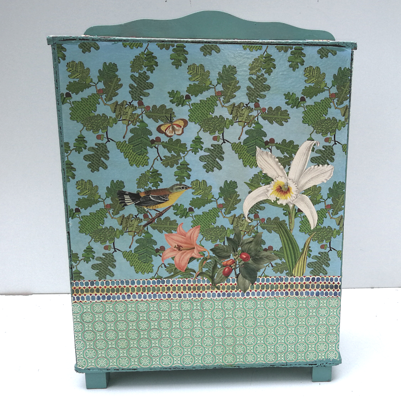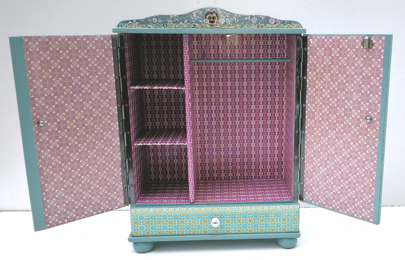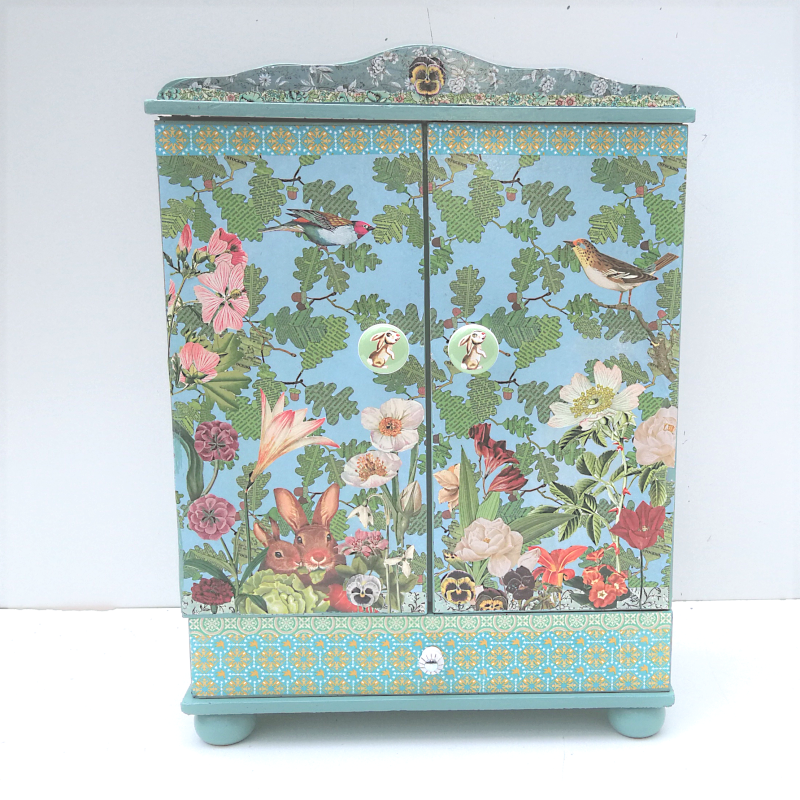 UNIKAT! Puppenschrank mit einer Schublade, zwei Türen, 3 Regalbrettern, Kleiderstange und Porzellangriffen mit Hasen. Auf einem Hintergrundpapier mit Eichenblättern und Eicheln ist ein Frühlingsbeet zu sehen. Auf der linken Tür kuscheln sich zwei Hasen in den Klee, auf der Deckplatte sitzen drei kleine hungrige Mäuse neben einem Vogelhäuschen mit zwei Vögeln. Dieser Schrank passt farblich zum großen Puppenbett "Kolibris" (Einzelpreis: 65,- €) Komplettpreis: 175 €. VERSAND MÖGLICH.