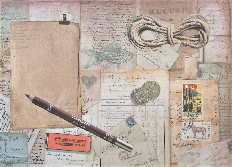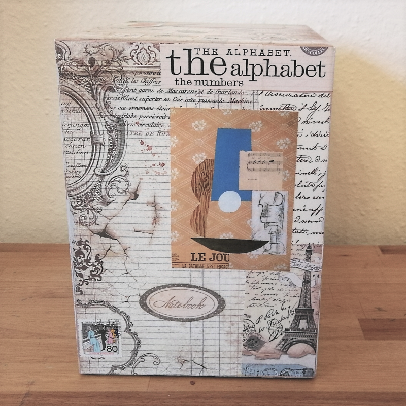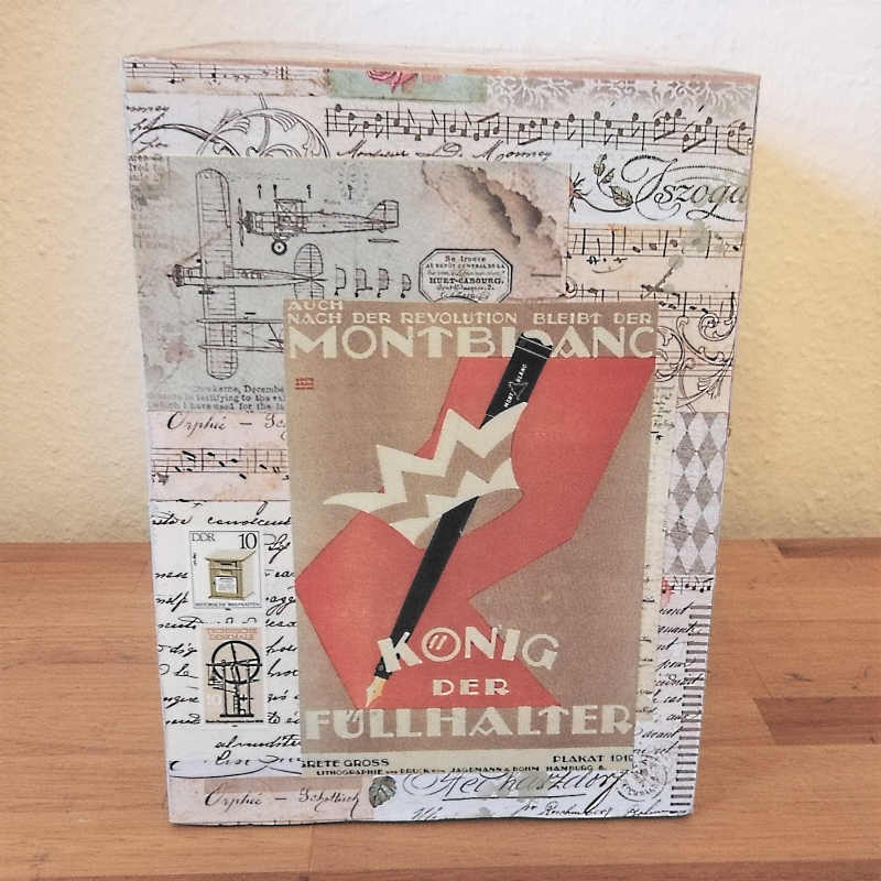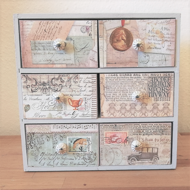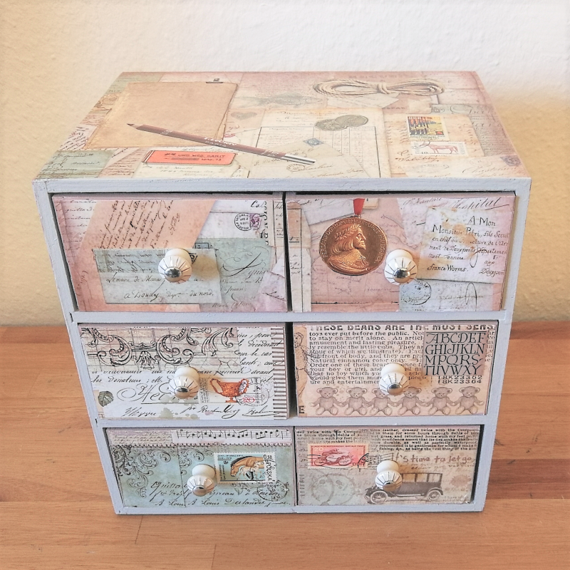 UNIKAT! Minikommode mit sechs Schubladen und Porzellangriffen. Alle Flächen sind aufwändig mit Schriftpapieren, Briefmarken und Details mit Tromp l'oeil Effekt gestaltet. Die Schubladen bieten Platz für Stifte, Briefmarken und der gleichen mehr. VERSAND MÖGLICH.