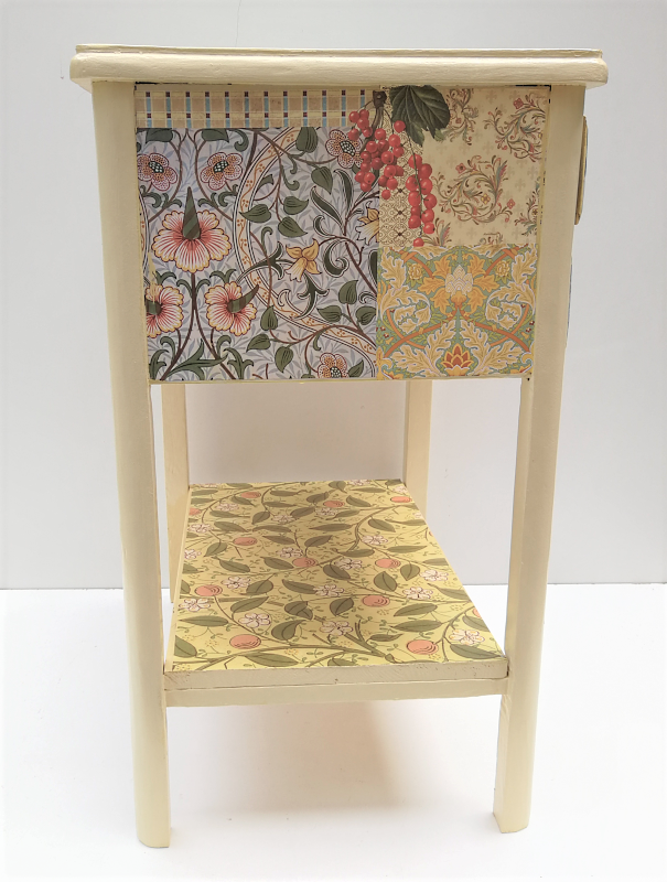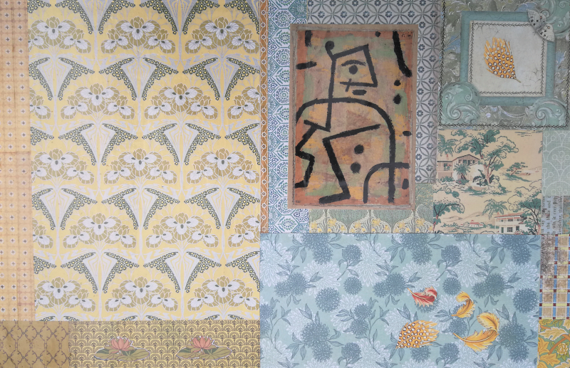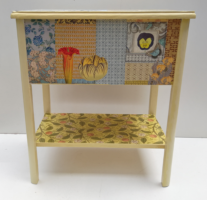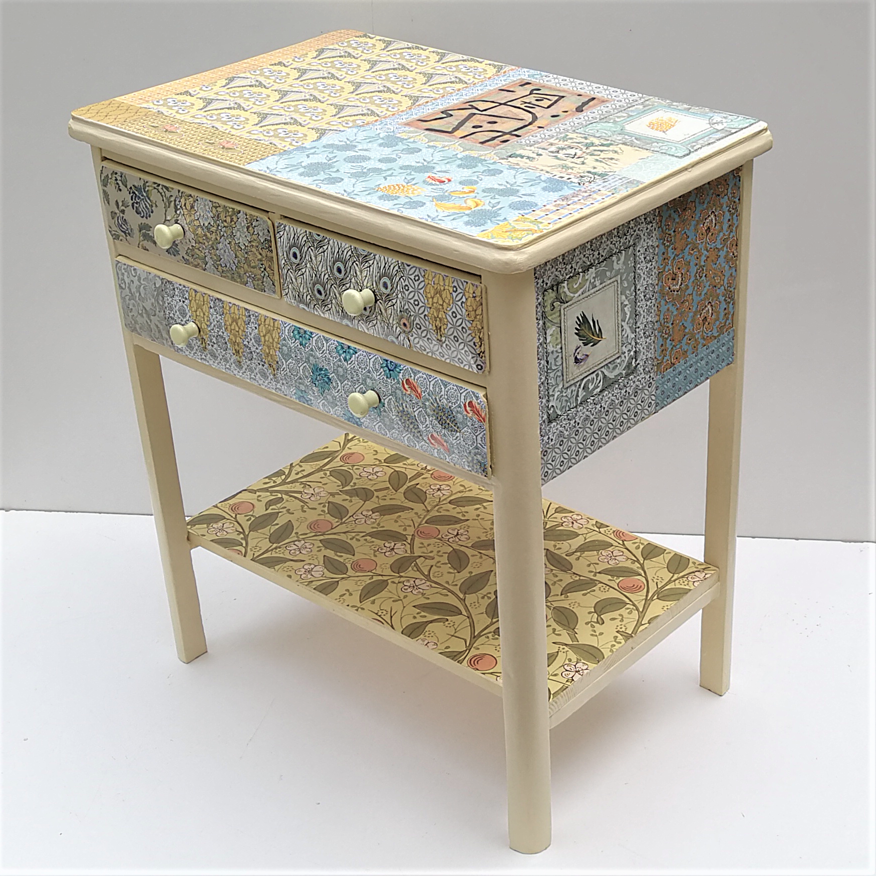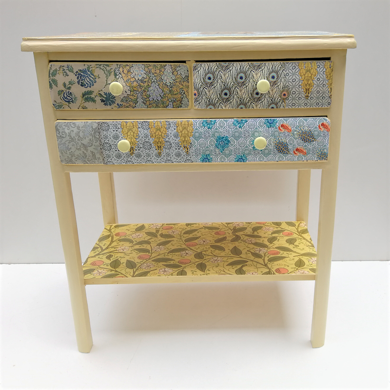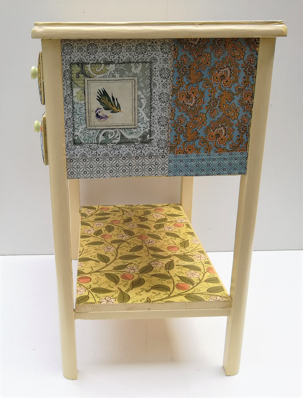 UNIKAT! Schubladentisch mit drei Schubladen, einem Zwischenbrett und gelben Keramikknöpfen. Die Gestaltung konzentriert sich auf die Farben Gelb und Blau. Es finden Musterpapiere und Art Deco Papiere Verwendung. Auf der Deckplatte fällt der Blick auf ein Bild von Paul Klee. Einige farbige Federn aus einem italienischen Buntpapier vervollständigen die Gestaltung. KEIN VERSAND. Bitte nachfragen, ob eine Anlieferung innerhalb Deutschlands möglich ist.