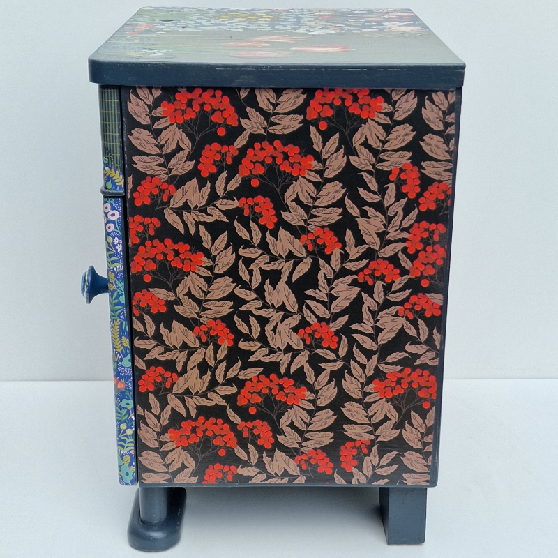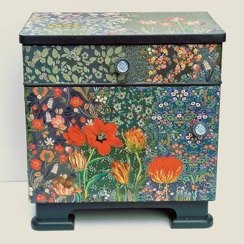 UNIKAT! Niedrige Kommode mit einer Tür, einer Schublade und Metallgriffen mit Muster unter einem Carbochon aus Glas. Alle Flächen sind mit Blumenpapieren gestaltet, die durch Einzelblüten miteinander verbunden sind. So entsteht der Eindruck eines Mille Fleurs Musters. Auf diesem Hintergrund blühen rote und gelbe Tulpen. Die Seiten ziert ein Beerenmuster auf dunklem Hintegrund. VERSAND MÖGLICH.