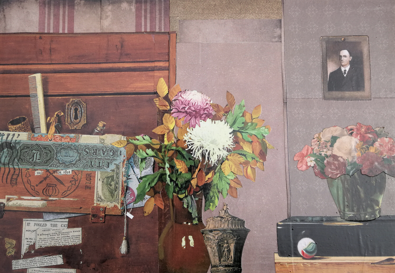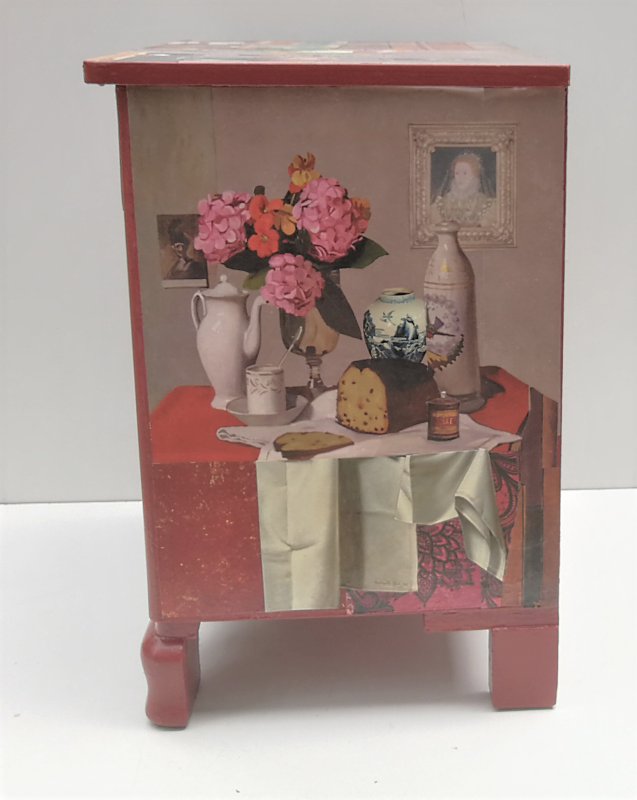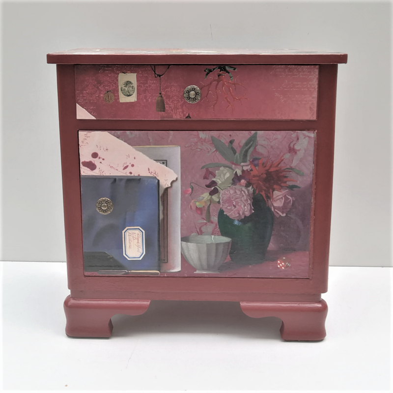 UNIKAT! Nachtschrank mit geschwungen Beinen mit einer Tür, einer Schublade und Porzellangriffen. Auf allen Flächen sind Stillleben mit Blumenvasen auf braunem und rotem Hintergrund zu sehen. Die Gestaltung besteht zum größten Teil aus Details von Blumenbildern von Felix Vallotton und Innenräumen. VERSAND MÖGLICH.