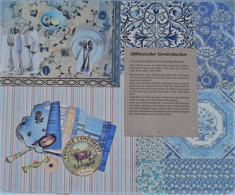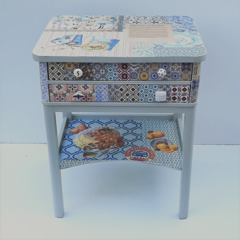 UNIKAT! Tischchen mit zwei Schubladen, einem Zwischenbrett und unterschiedlichen weißen Porzellangriffen. Die Gestaltung besteht aus blau-weißen Musterpapieren in Fliesenoptik, einem Rezept aus einem alten friesischen Kochbuch und Obst-, Käse- und Besteckabbildungen. KEIN VERSAND.